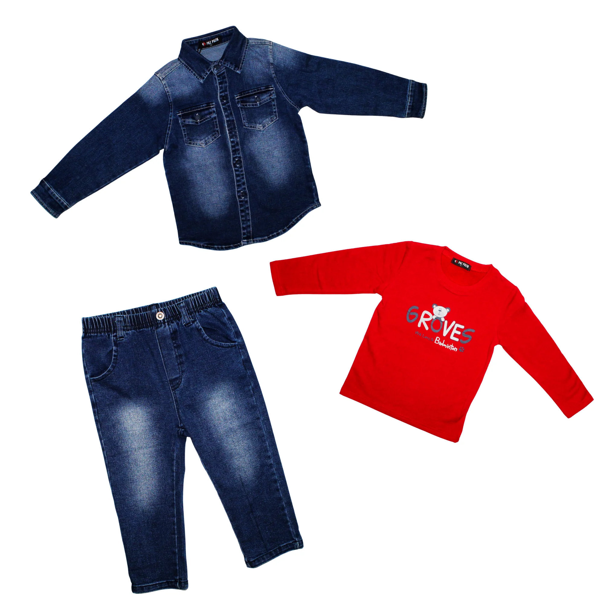 Conjunto para Niño marca Poz Pozik, en color rojo y detalles en mezclilla. Fabricado en materiales de calidad, es ideal para su uso cotidiano.